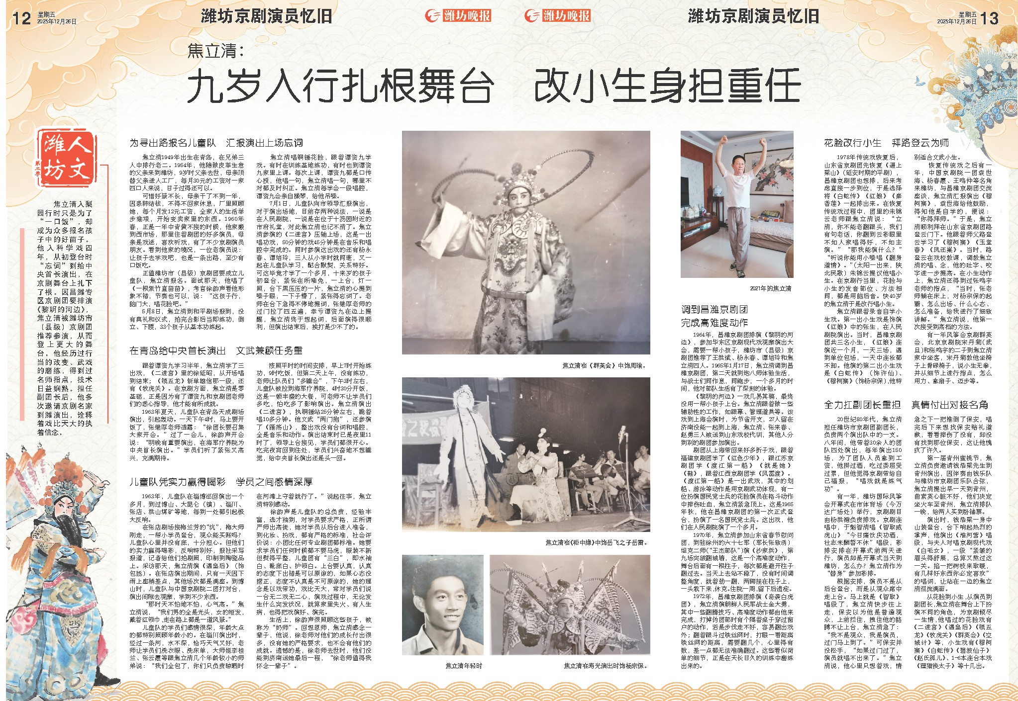 焦立清入梨园行时只是为了“一口饭”,却成为众多报名孩子中的好苗子。他入科学戏四年,从初登台时“忘词”到给中央首长演出,在京剧舞台上扎下了根。因昌潍专区京剧团要排演《黎明的河边》,焦立清被潍坊市(县级)京剧团推荐参演,从而登上更大的舞台。他经历过行当的改变、武戏的磨练,得到过名师指点,技术日益娴熟。担任副团长后,他多次邀请京剧名家到潍演出,诠释着戏比天大的执着信念。