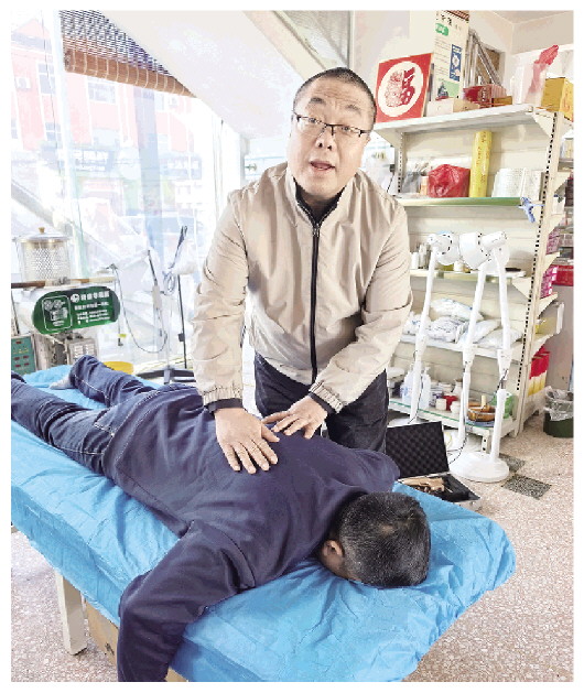 12月26日上午,记者在诸城市林家村镇的诸城市弓长中医馆看到,有5名患者正在排队等候张大洲的摸骨调理,患者既有周边居民,也有慕名而来的外地人。张大洲正带着徒弟给一名来自日照市的患者进行摸骨诊疗,他让患者躺到床上,示范对方进行各种轻推慢移的拉伸动作,指导徒弟顺势给患者一个支点,让患者发力矫正自己的错位。经过20分钟调理,患者兴奋地说:“腰疼减轻了,浑身变轻松了,脑子感觉也清醒了。”