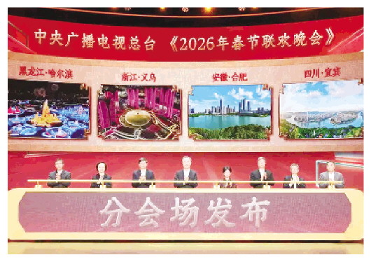 本报综合消息 12月28日,中央广播电视总台《2026年春节联欢晚会》分会场发布。黑龙江哈尔滨、浙江义乌、安徽合肥、四川宜宾将与北京主会场一起,打造彰显文化底蕴、洋溢民俗风情的新春舞台,为春晚这一文化年夜饭注入各具特色的时代气息和别样魅力。