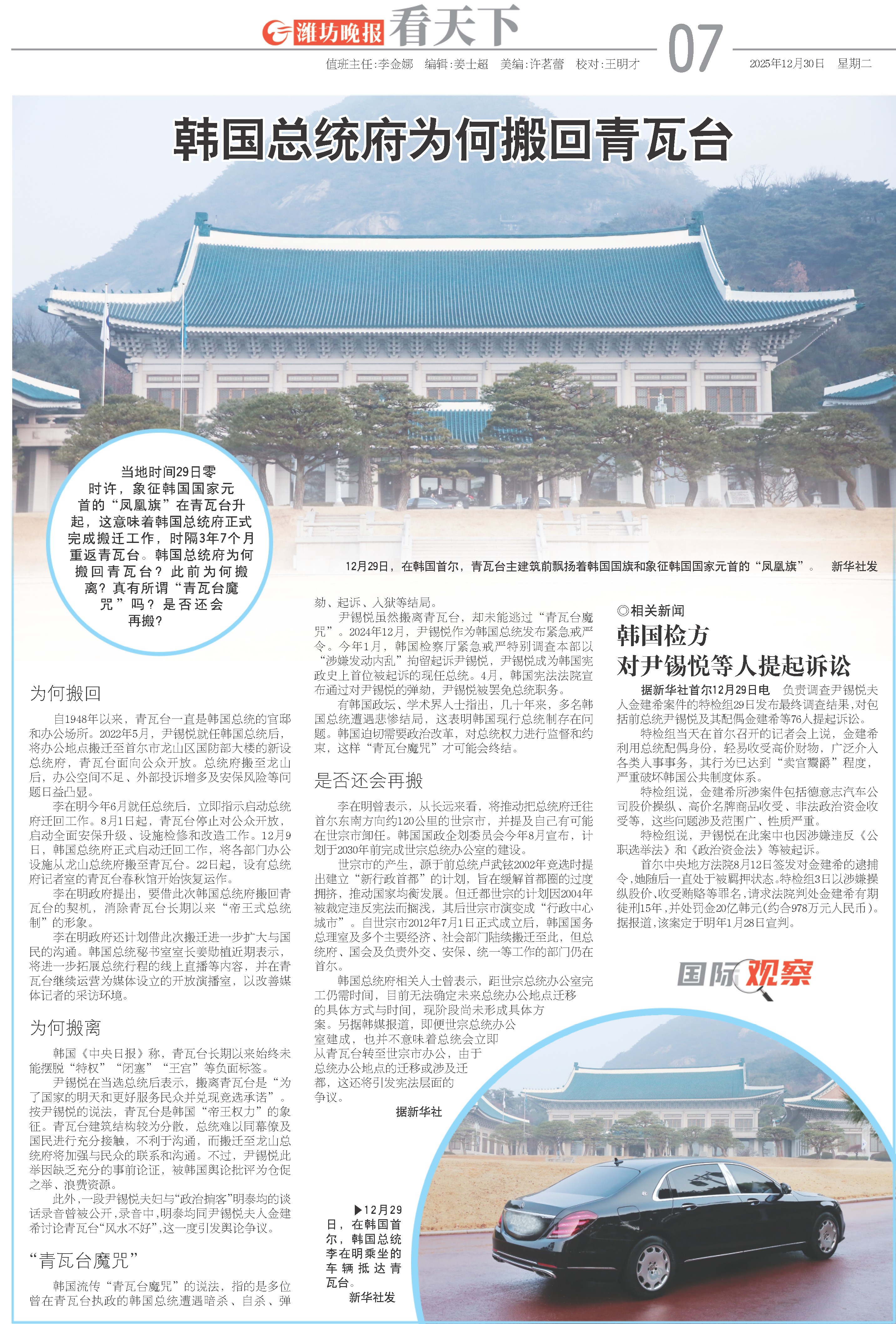 尹锡悦虽然搬离青瓦台,却未能逃过“青瓦台魔咒”。2024年12月,尹锡悦作为韩国总统发布紧急戒严令。今年1月,韩国检察厅紧急戒严特别调查本部以“涉嫌发动内乱”拘留起诉尹锡悦,尹锡悦成为韩国宪政史上首位被起诉的现任总统。4月,韩国宪法法院宣布通过对尹锡悦的弹劾,尹锡悦被罢免总统职务。