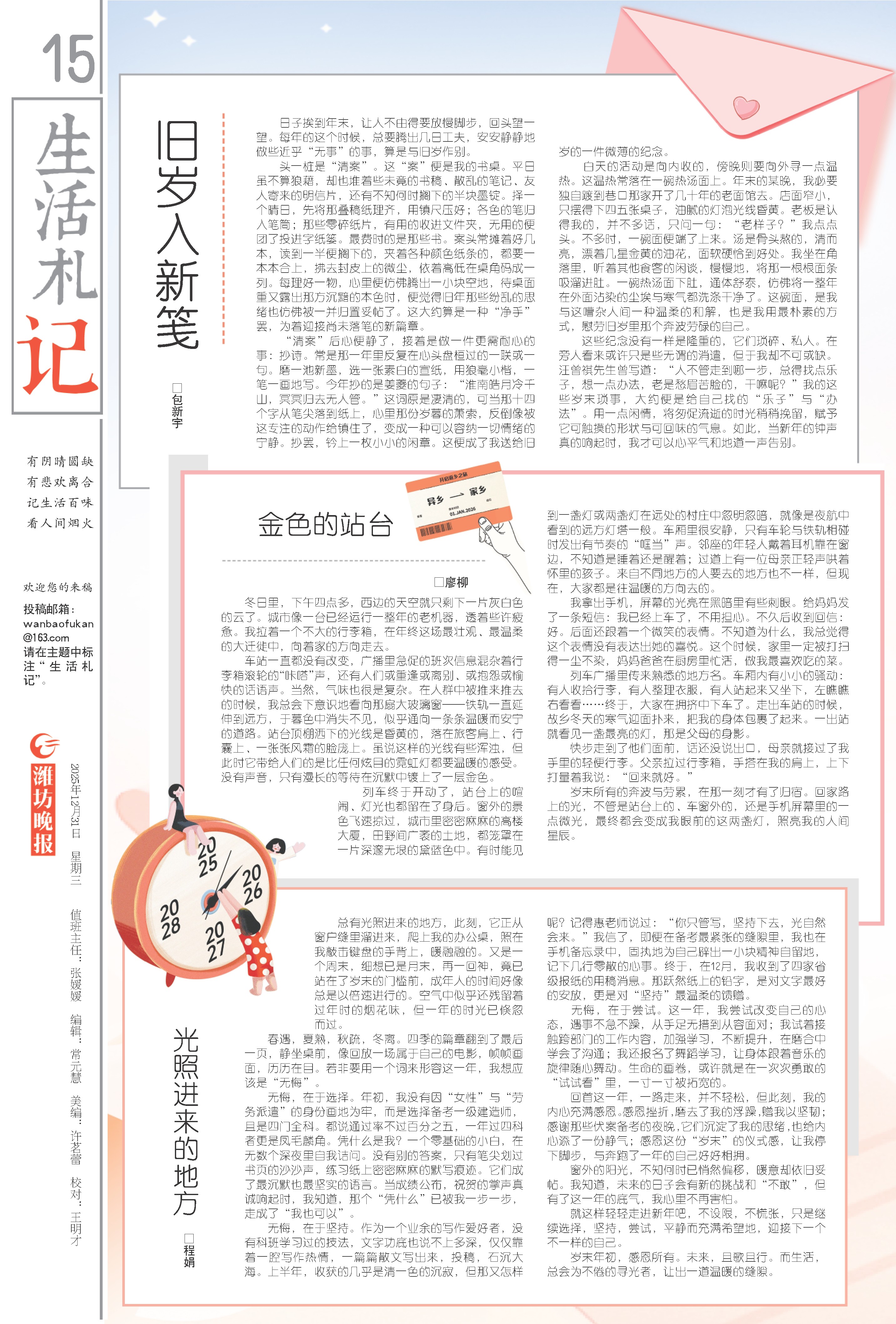无悔,在于坚持。作为一个业余的写作爱好者,没有科班学习过的技法,文字功底也说不上多深,仅仅靠着一腔写作热情,一篇篇散文写出来,投稿,石沉大海。上半年,收获的几乎是清一色的沉寂,但那又怎样呢?记得惠老师说过:“你只管写,坚持下去,光自然会来。”我信了,即便在备考最紧张的缝隙里,我也在手机备忘录中,固执地为自己辟出一小块精神自留地,记下几行零散的心事。终于,在12月,我收到了四家省级报纸的用稿消息。那跃然纸上的铅字,是对文字最好的安放,更是对“坚持”最温柔的馈赠。