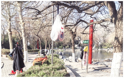 记者在公园内看到,多处便民服务衣帽架上悬挂着市民的物品,也有不少架子是空的。有市民随意把装蔬菜的袋子、挎包挂在围栏上,有的把包挂在“创建文明城市”公益广告牌上,还有的市民把自己的物品随意挂在树枝上、搭在绿化带上……这些不文明行为与周围的美景很不协调。
