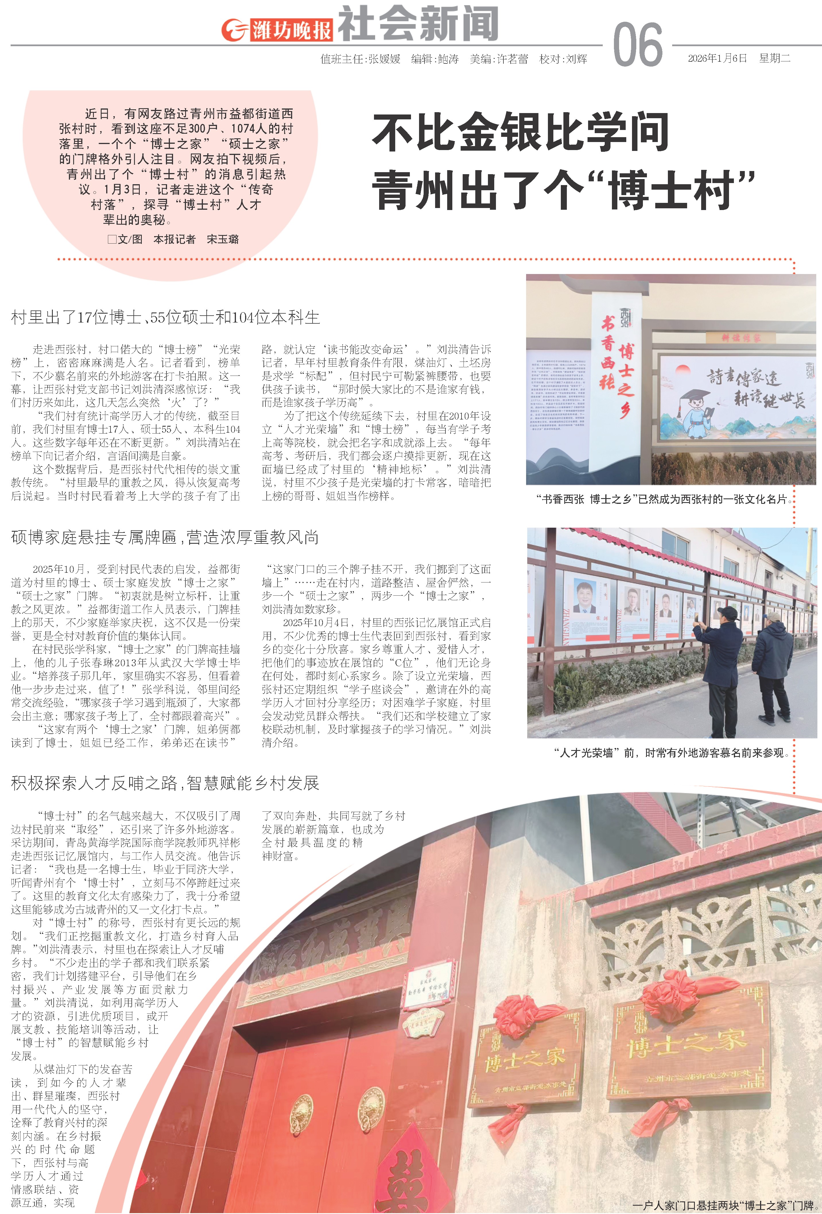 近日,有网友路过青州市益都街道西张村时,看到这座不足300户、1074人的村落里,一个个“博士之家”“硕士之家”的门牌格外引人注目。网友拍下视频后,青州出了个“博士村”的消息引起热议。1月3日,记者走进这个“传奇村落”,探寻“博士村”人才辈出的奥秘。