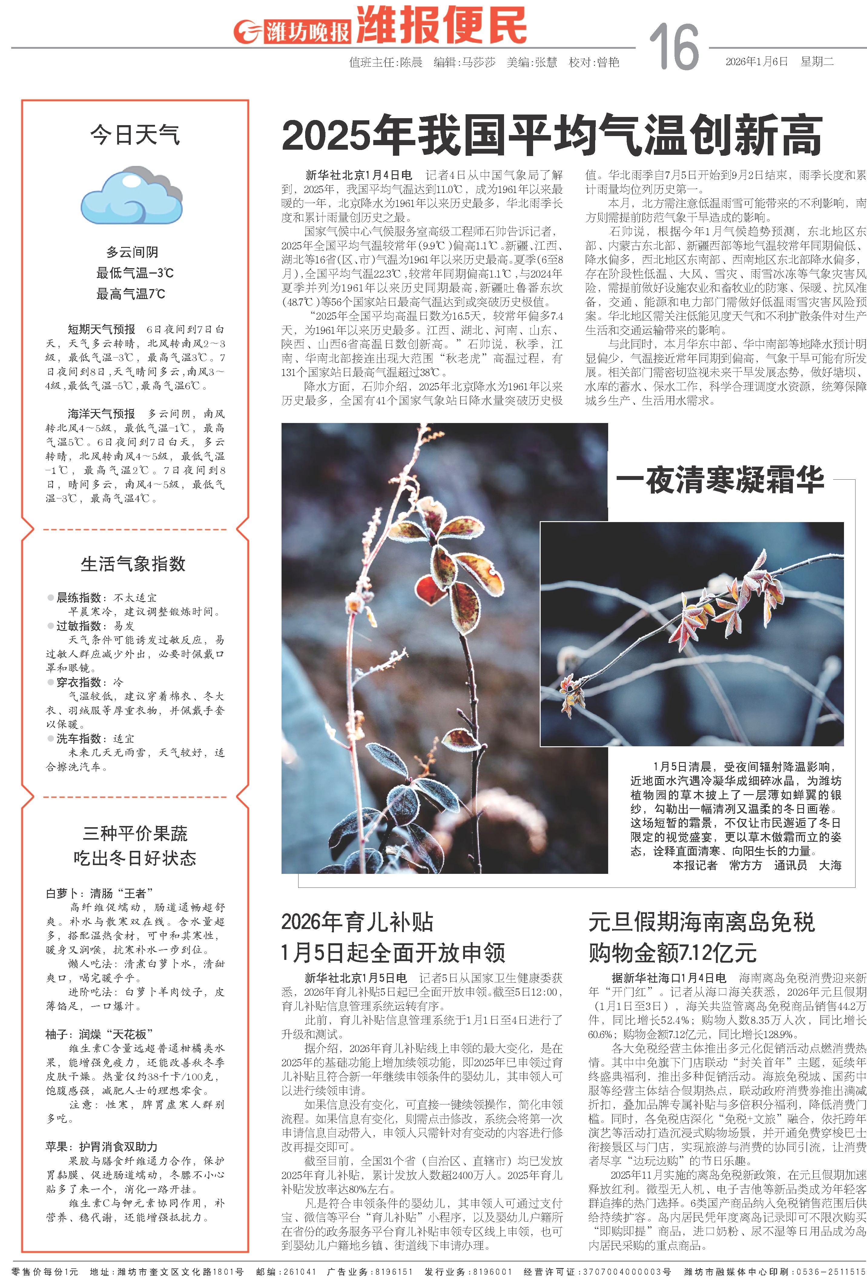 1月5日清晨,受夜间辐射降温影响,近地面水汽遇冷凝华成细碎冰晶,为潍坊植物园的草木披上了一层薄如蝉翼的银纱,勾勒出一幅清冽又温柔的冬日画卷。这场短暂的霜景,不仅让市民邂逅了冬日限定的视觉盛宴,更以草木傲霜而立的姿态,诠释直面清寒、向阳生长的力量。