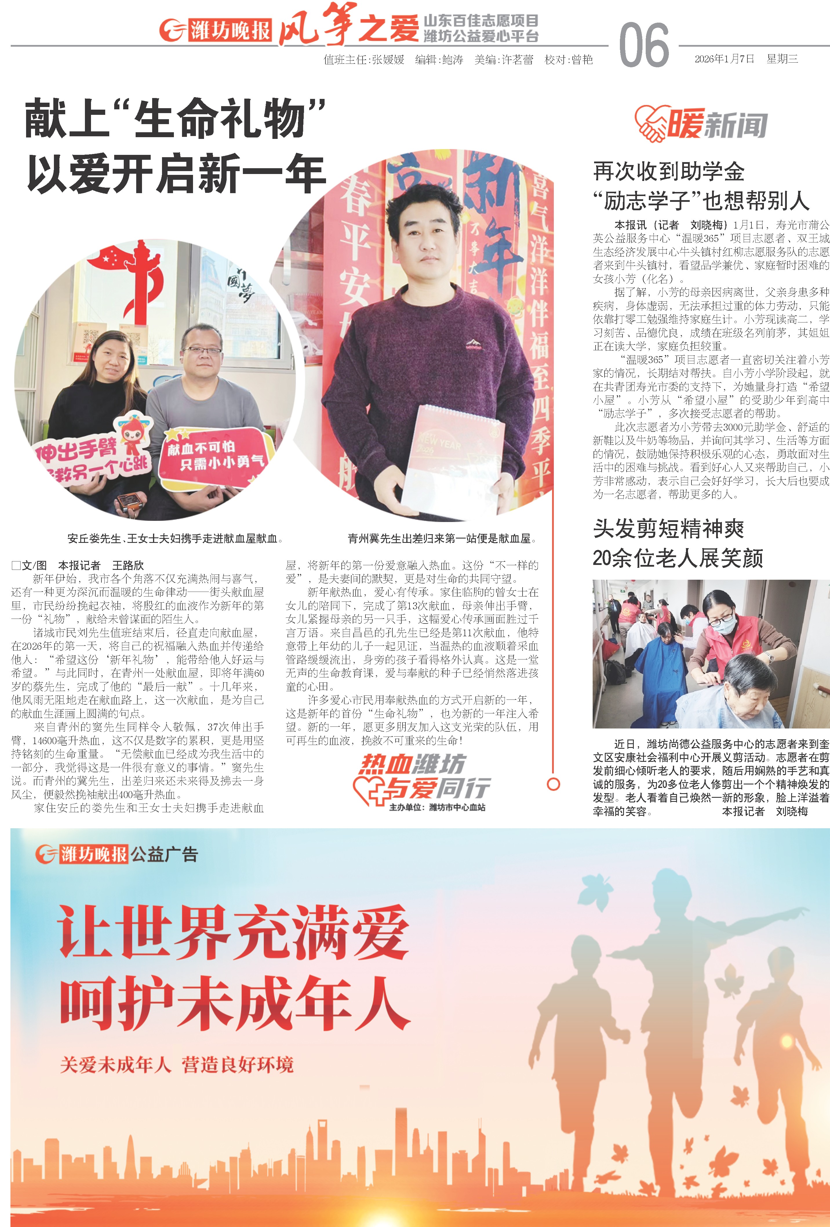 本报讯(记者 刘晓梅)1月1日,寿光市蒲公英公益服务中心“温暖365”项目志愿者、双王城生态经济发展中心牛头镇村红柳志愿服务队的志愿者来到牛头镇村,看望品学兼优、家庭暂时困难的女孩小芳(化名)。