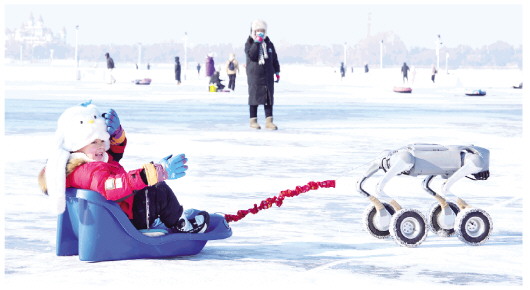 1月11日,小朋友在松花江哈尔滨段江面上体验机器狗拉爬犁。当下,“冰城”哈尔滨市正值冰雪季,冰雪覆盖着的松花江哈尔滨段江面化身为冰雪欢乐场,吸引游客和市民尽享冰雪娱乐运动带来的快乐。 新华社发