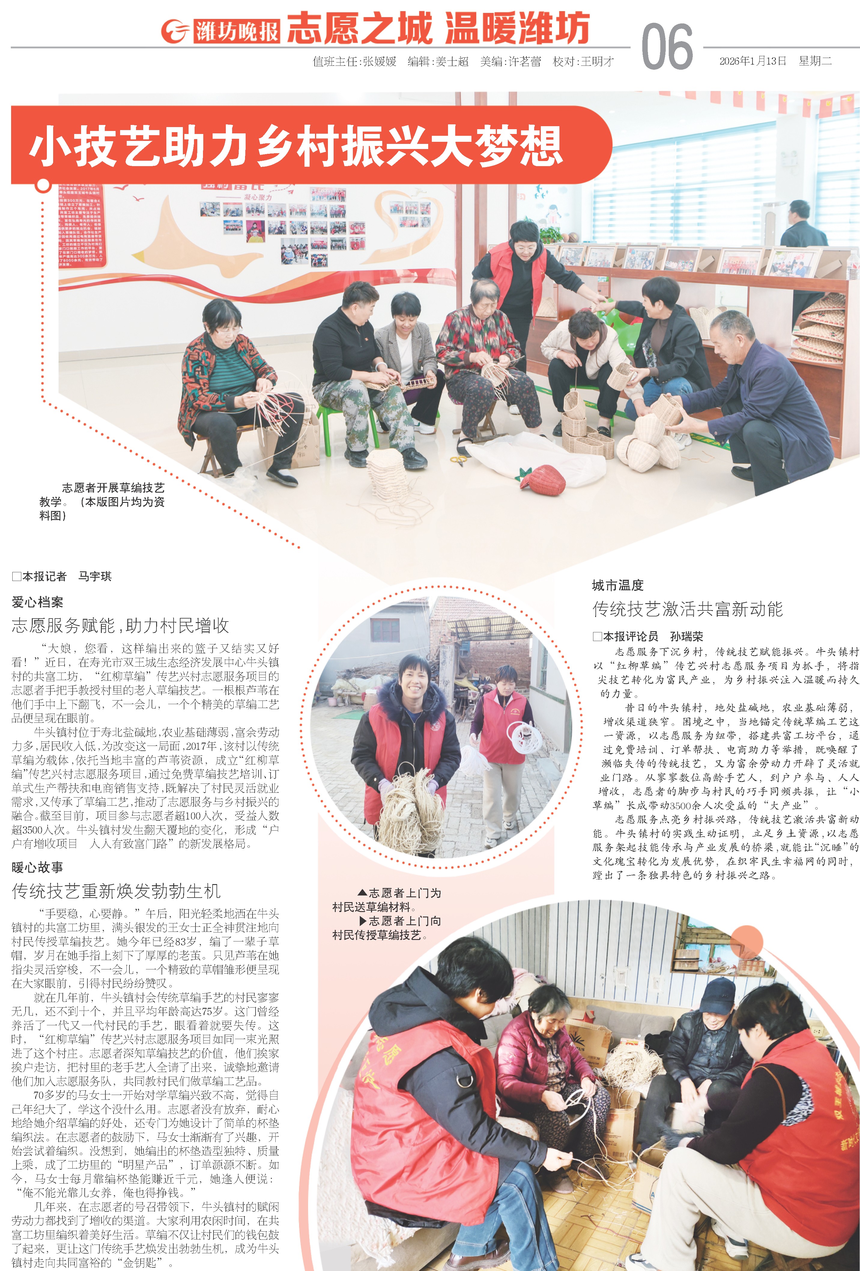 昔日的牛头镇村,地处盐碱地,农业基础薄弱,增收渠道狭窄。困境之中,当地锚定传统草编工艺这一资源,以志愿服务为纽带,搭建共富工坊平台,通过免费培训、订单帮扶、电商助力等举措,既唤醒了濒临失传的传统技艺,又为富余劳动力开辟了灵活就业门路。从寥寥数位高龄手艺人,到户户参与、人人增收,志愿者的脚步与村民的巧手同频共振,让“小草编”长成带动3500余人次受益的“大产业”。