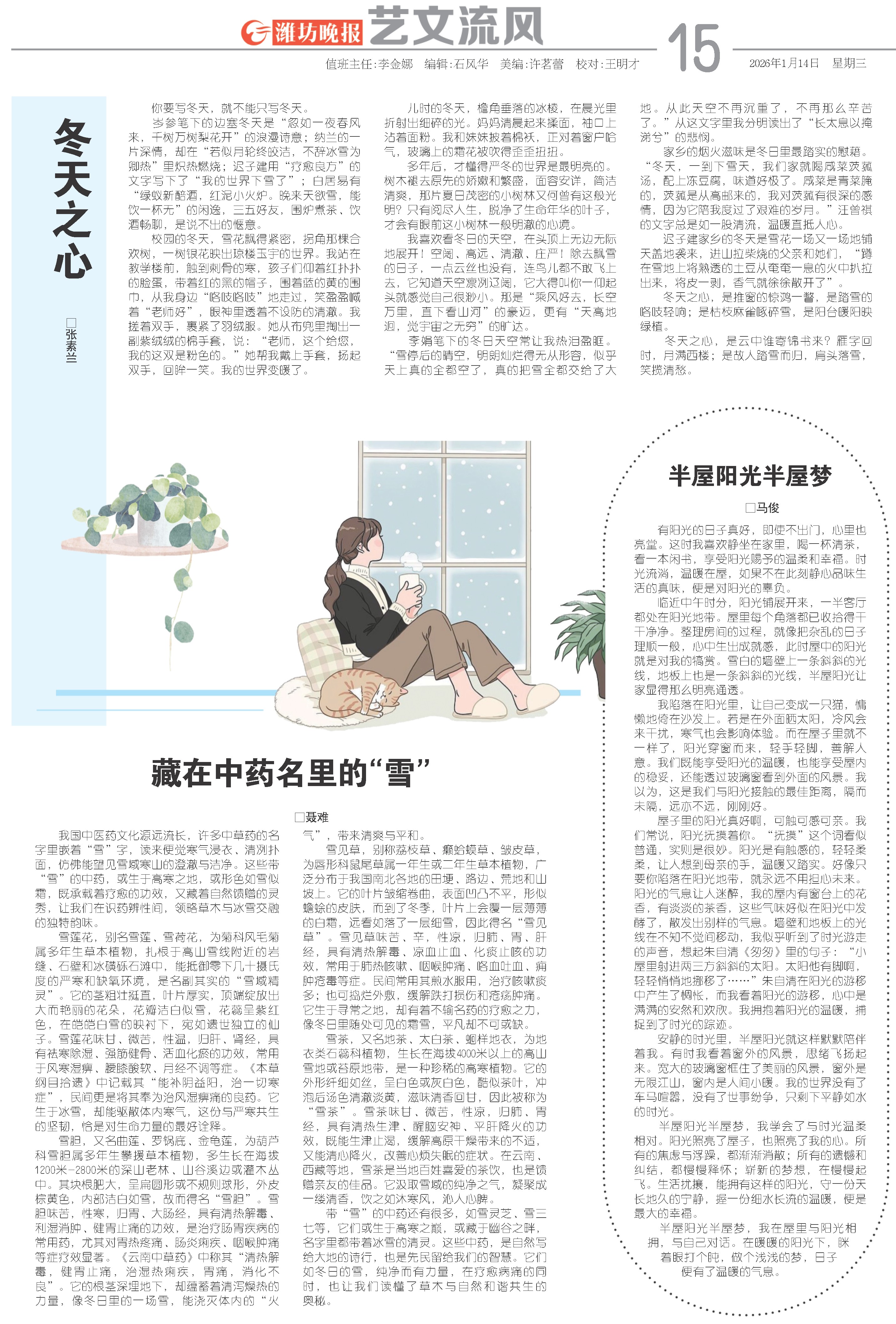 我陷落在阳光里,让自己变成一只猫,慵懒地倚在沙发上。若是在外面晒太阳,冷风会来干扰,寒气也会影响体验。而在屋子里就不一样了,阳光穿窗而来,轻手轻脚,善解人意。我们既能享受阳光的温暖,也能享受屋内的稳妥,还能透过玻璃窗看到外面的风景。我以为,这是我们与阳光接触的最佳距离,隔而未隔,远亦不远,刚刚好。
