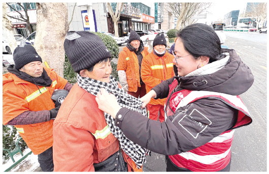 1月19日,在城区东风西街,正在扫雪的环卫工人收到了潍城区城关街道曹家巷社区工作人员送来的御寒物资。当日,社区工作人员将一份份“暖心礼包”送到环卫工人手中,里面有御寒的毛线帽、围巾、手套等物品,用贴心关怀为城市美容师驱散严寒,致敬他们日复一日的坚守。 本报记者 张驰