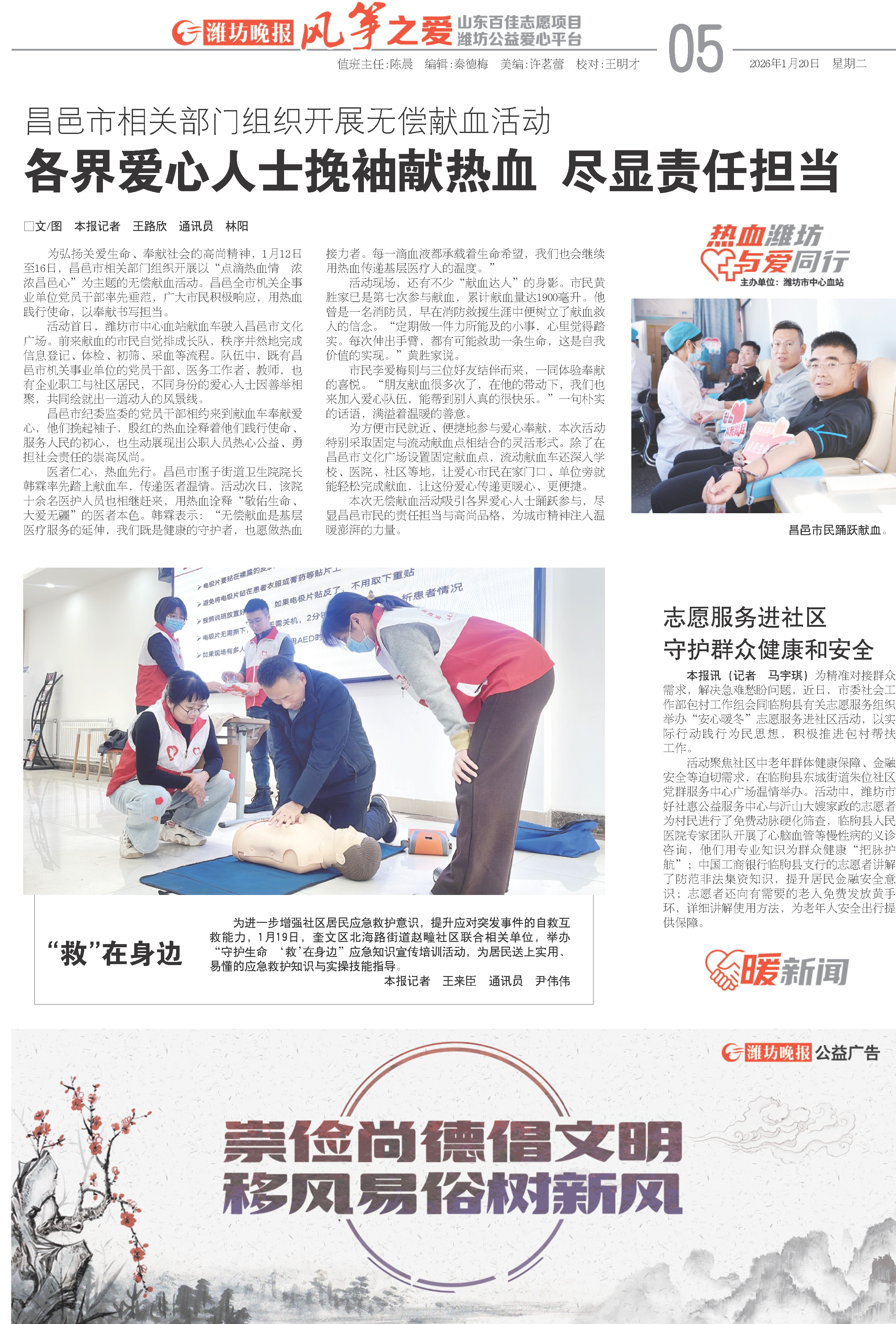 为弘扬关爱生命、奉献社会的高尚精神,1月12日至16日,昌邑市相关部门组织开展以“点滴热血情 浓浓昌邑心”为主题的无偿献血活动。昌邑全市机关企事业单位党员干部率先垂范,广大市民积极响应,用热血践行使命,以奉献书写担当。