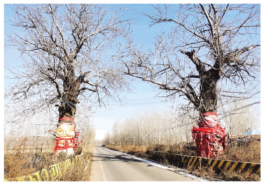 古树粗壮的树干上缠满寄托着美好寓意的红绸,通过红绸的缝隙,能看到“昌乐县古树名木保护牌”,信息显示两棵古树都是毛白杨,树龄都在400年左右。在我市的古树名木中,树种以国槐居多。这两棵树龄均高达400年左右的毛白杨隔路相望,部分枝干又相交于一起,仿佛两位老友在握手打招呼一般,确实非常稀有。