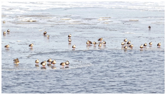 1月24日,昌邑市下营镇的海边,成群的野鸭像约好了出来聚会一样,在结冰的海面上嬉戏觅食,为萧瑟寒冬增添了灵动的生机。