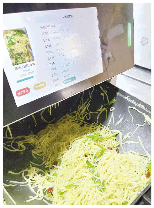 “酸辣土豆丝好吃,菜盆里快没有了,能再来点吗?不够吃了。”一位顾客“喊话”时晓萌。“稍等1分钟,接着出锅。”时晓萌查看后厨的智能炒菜机后说道。餐厅后厨,两台智能炒菜机正高速运转。据介绍,素菜1分钟-2分钟、荤菜2分钟-4分钟即可出锅,日均可满足200多人就餐。“所有食材都是当天采购的新鲜产品,炒菜机按预设程序精准控温、调味,口味恒定且零接触烹饪。”工作人员介绍道。