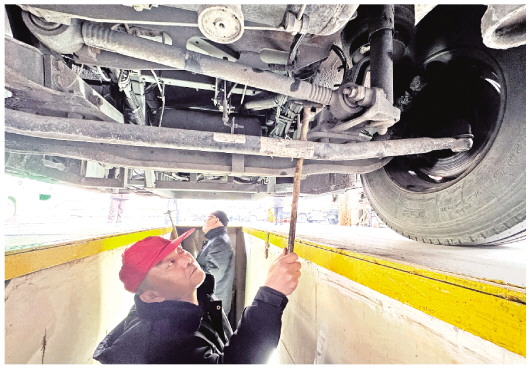 1月28日,在潍坊汽车总站安全检测站,安检人员正在对车辆进行检查。随着春运临近,连日来,潍坊汽车总站对所有营运车辆的制动系统、轮胎以及车辆灯光等进行全面检查,还仔细检查了车辆安全带、灭火器、安全锤等设施配备情况,为春运期间安全运行提供有力保障。 本报记者 张驰