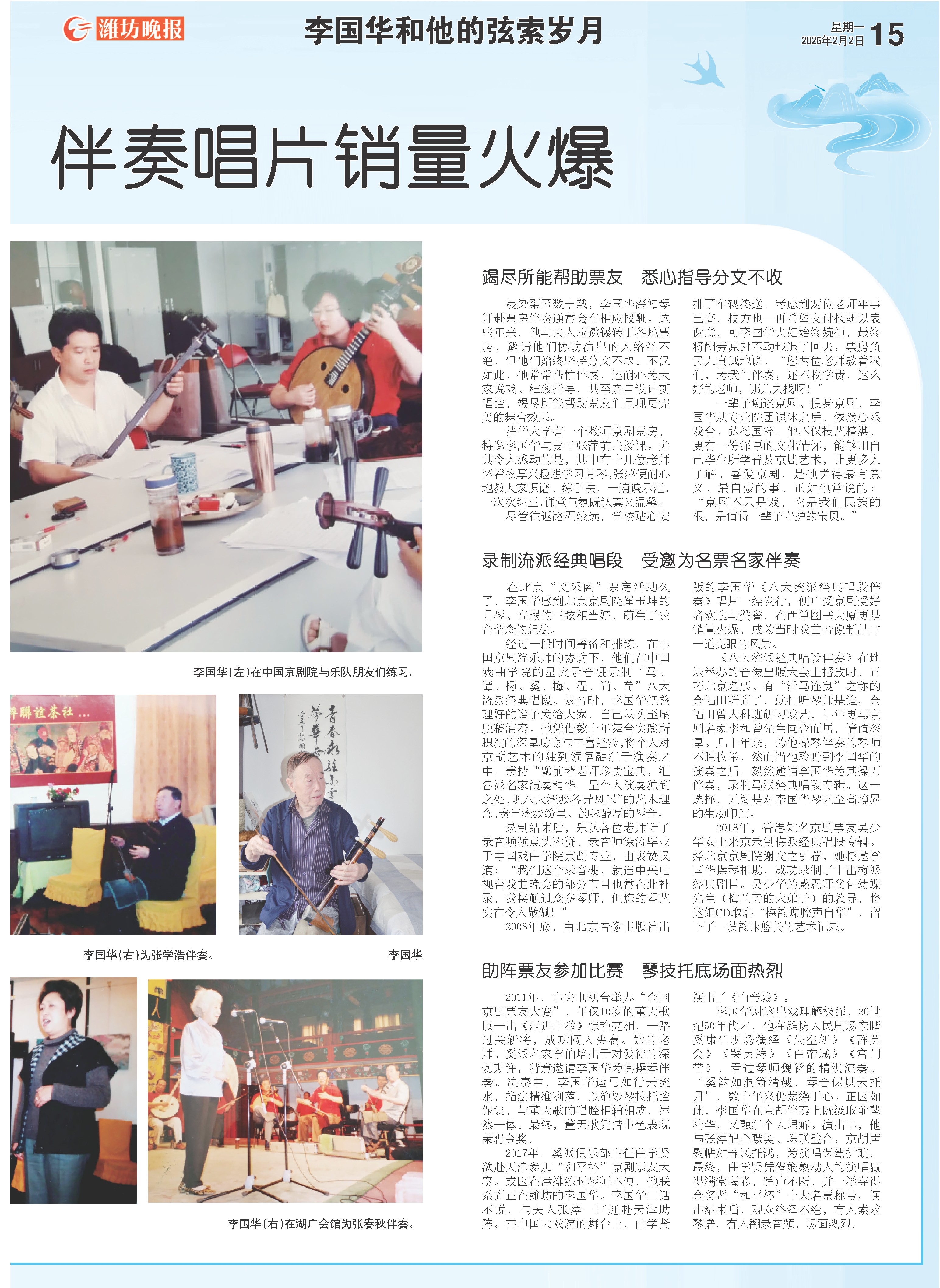 录制结束后,乐队各位老师听了录音频频点头称赞。录音师徐涛毕业于中国戏曲学院京胡专业,由衷赞叹道:“我们这个录音棚,就连中央电视台戏曲晚会的部分节目也常在此补录,我接触过众多琴师,但您的琴艺实在令人敬佩!”
