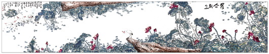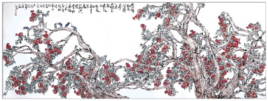 《繁荣昌盛图》是李冰奇二十八年前作品的同名之作。新作中,早年那种试图融合东西方文化的强烈张力,已沉淀为一种更为纯熟与深厚的表达。画中老石榴树的枝干以浓淡墨色皴擦点染,肌理嶙峋如苍龙游走,枝头石榴垂垂欲坠,殷红的果皮下仿佛漾着饱满的籽粒。石榴的美好寓意与“繁荣昌盛”的时代期许在此交融,自然物象由此承载起家国兴旺的深切祈愿。