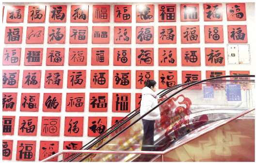2月4日,在奎文区泰华商圈,市民从巨型“万福墙”前经过。随着春节临近,两组高7米、宽7米的“万福墙”在泰华商圈亮相,造型各异的“福”字将新春“福气值”拉满。 本报记者 张驰