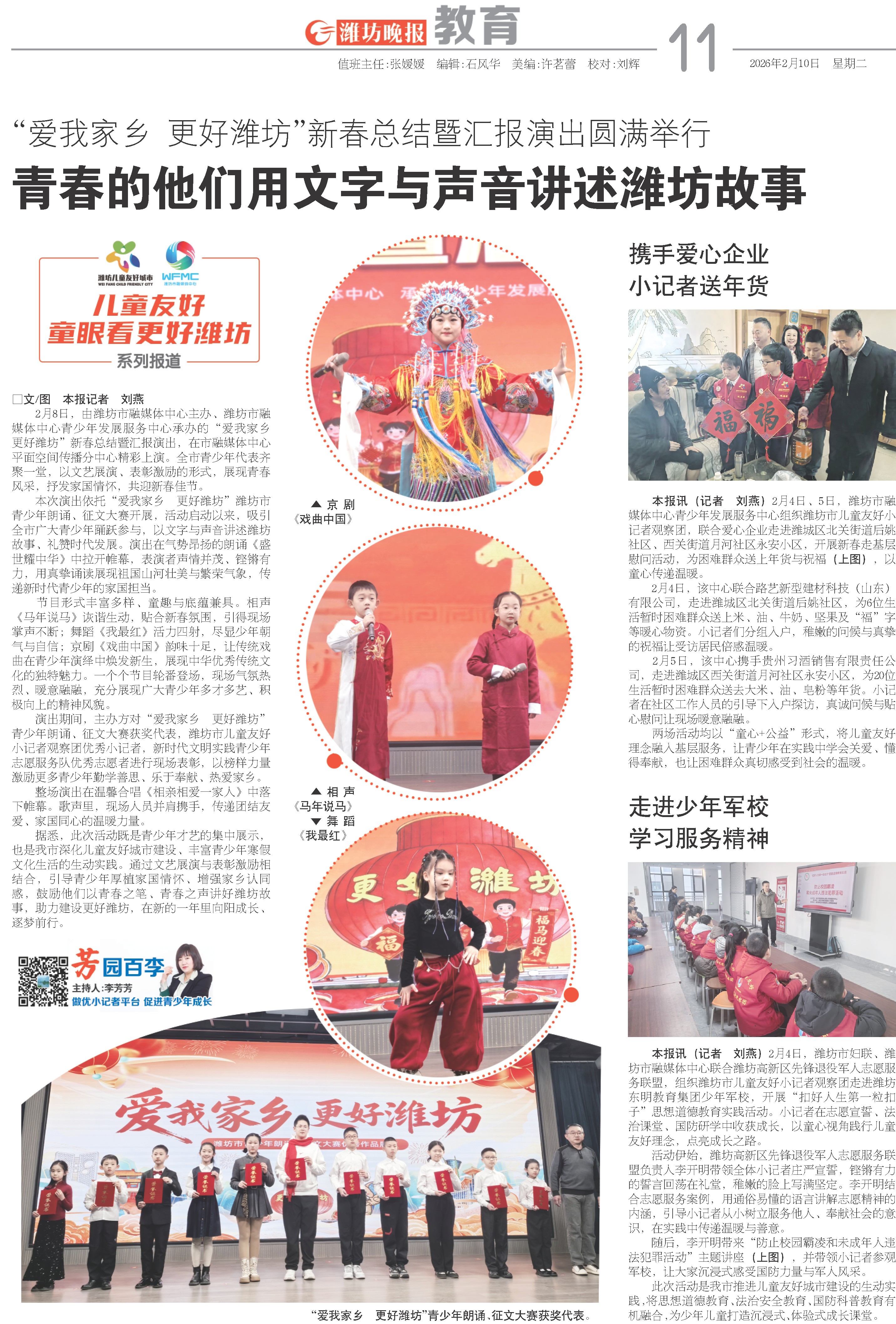 2月8日,由潍坊市融媒体中心主办、潍坊市融媒体中心青少年发展服务中心承办的“爱我家乡 更好潍坊”新春总结暨汇报演出,在市融媒体中心平面空间传播分中心精彩上演。全市青少年代表齐聚一堂,以文艺展演、表彰激励的形式,展现青春风采,抒发家国情怀,共迎新春佳节。