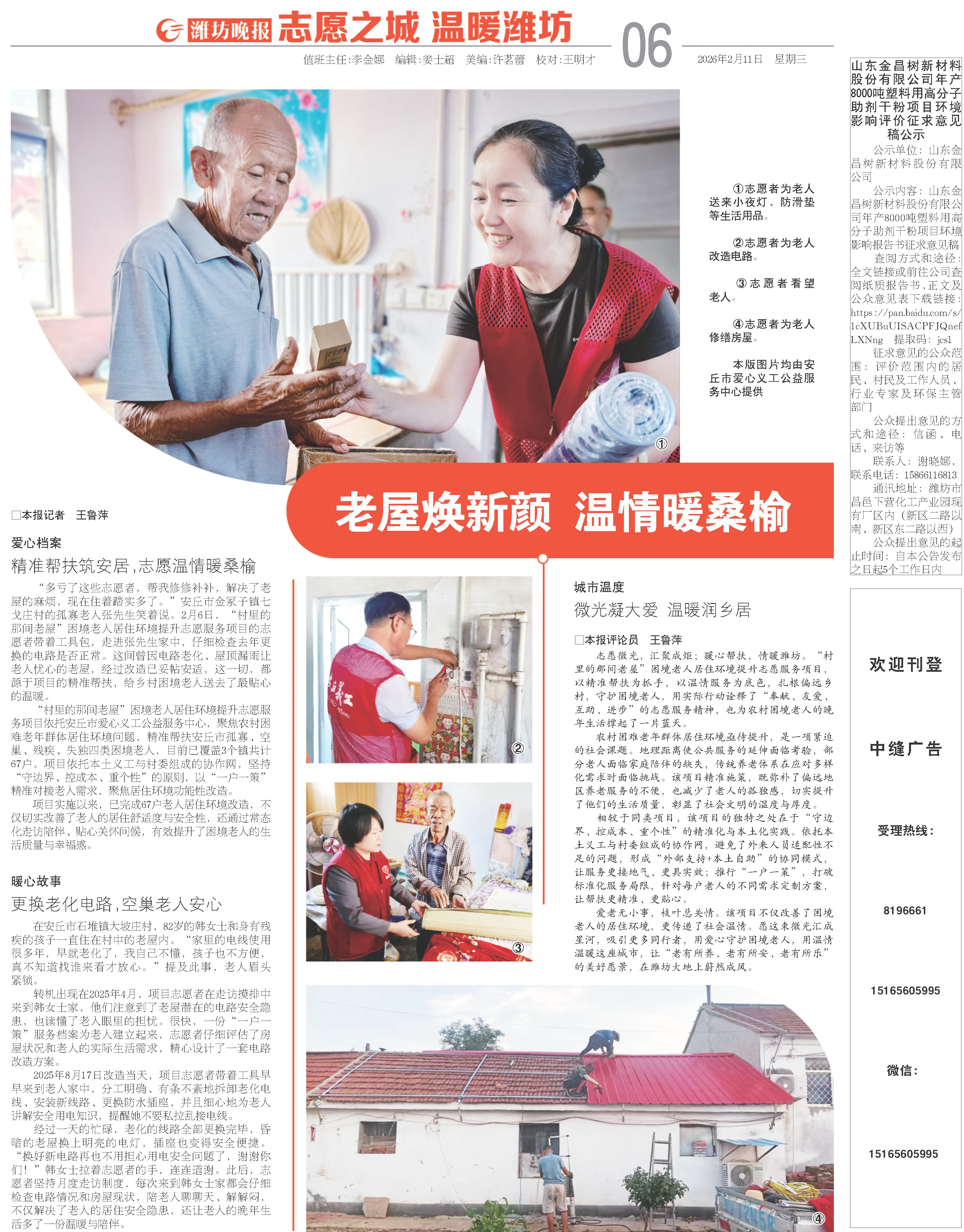 “多亏了这些志愿者,帮我修修补补,解决了老屋的麻烦,现在住着踏实多了。”安丘市金冢子镇七戈庄村的孤寡老人张先生笑着说。2月6日,“村里的那间老屋”困境老人居住环境提升志愿服务项目的志愿者带着工具包,走进张先生家中,仔细检查去年更换的电路是否正常。这间曾因电路老化、屋顶漏雨让老人忧心的老屋,经过改造已妥帖安适,这一切,都源于项目的精准帮扶,给乡村困境老人送去了最贴心的温暖。
