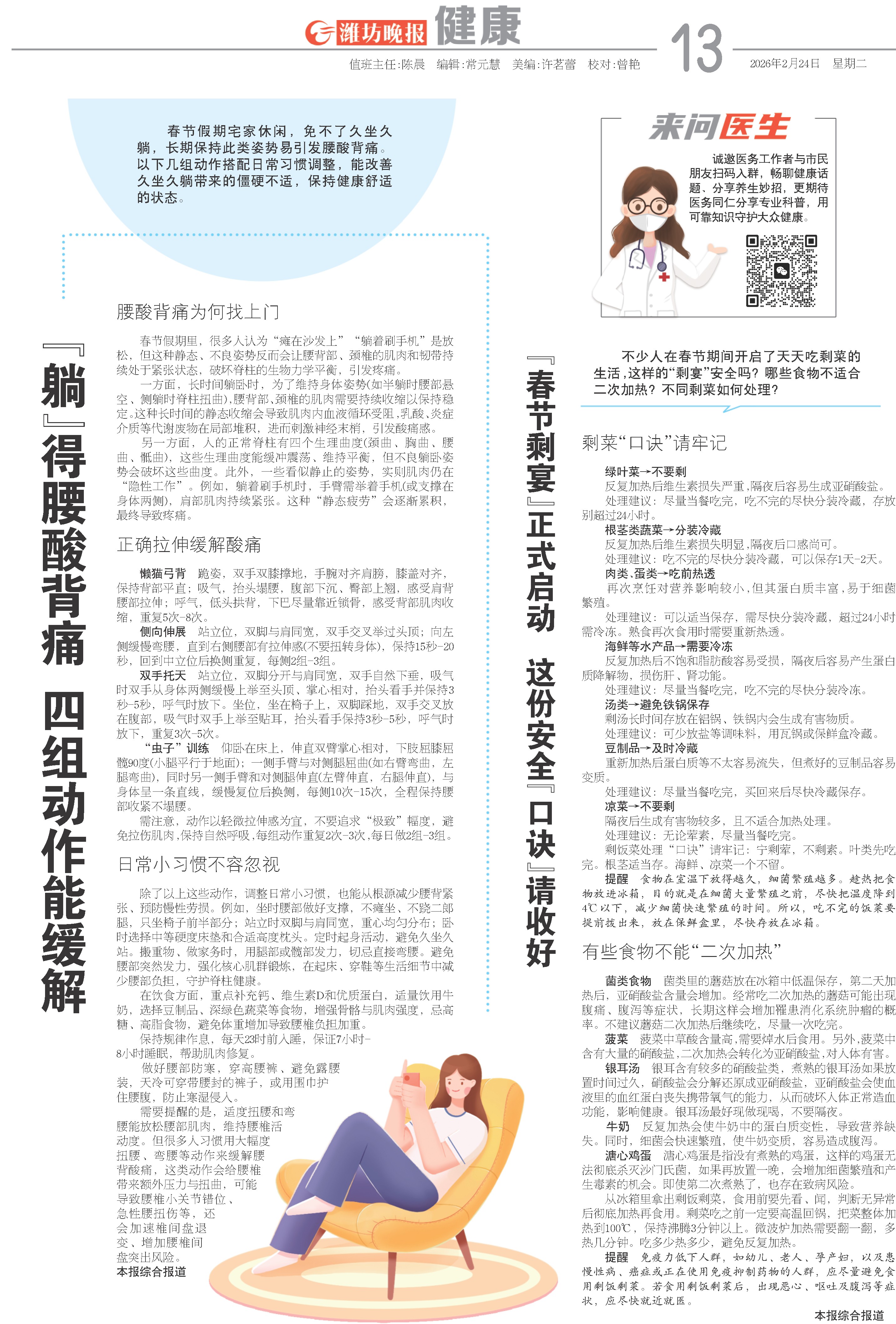 春节假期里,很多人认为“瘫在沙发上”“躺着刷手机”是放松,但这种静态、不良姿势反而会让腰背部、颈椎的肌肉和韧带持续处于紧张状态,破坏脊柱的生物力学平衡,引发疼痛。