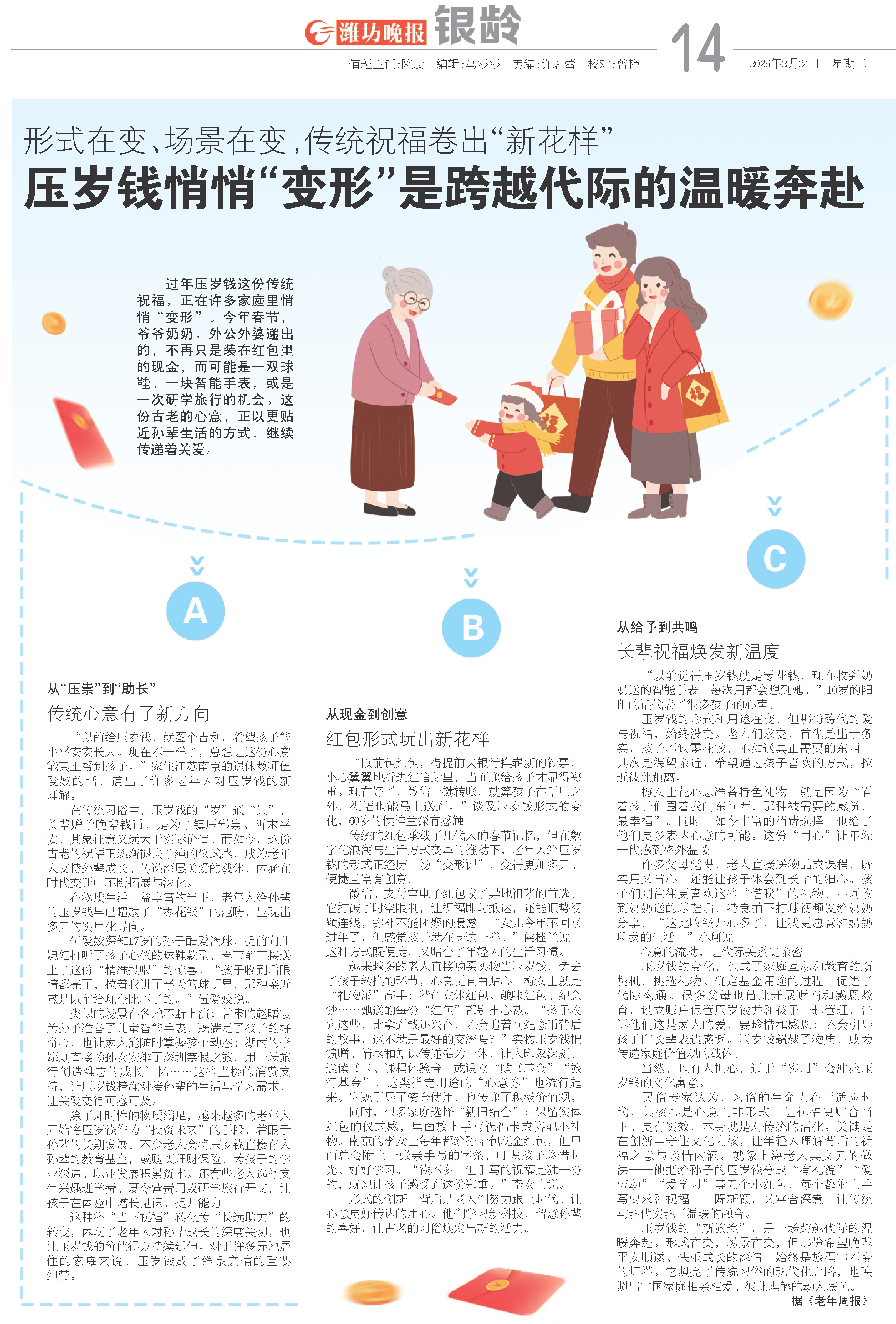 民俗专家认为,习俗的生命力在于适应时代,其核心是心意而非形式。让祝福更贴合当下、更有实效,本身就是对传统的活化。关键是在创新中守住文化内核,让年轻人理解背后的祈福之意与亲情内涵。就像上海老人吴文元的做法——他把给孙子的压岁钱分成“有礼貌”“爱劳动”“爱学习”等五个小红包,每个都附上手写要求和祝福——既新颖,又富含深意,让传统与现代实现了温暖的融合。