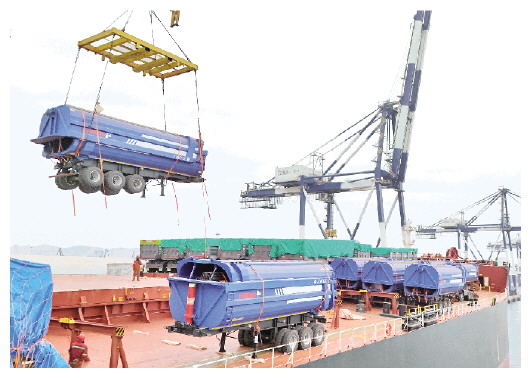 2月24日,在山东港口烟台港,工人将出口卡车吊装上船(无人机照片)。当日是春节假期结束后的第一个工作日,各地企业纷纷开工生产。 新华社发