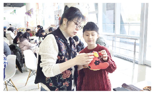 潍坊刺绣市级非遗代表性传承人于静作为志愿者来到当天的活动现场,手把手教孩子们穿针引线(上图)。“来,这样捏着针,慢慢穿过去。”在她的指导下,一个个憨态可掬的布老虎在孩子们手中逐渐成形。