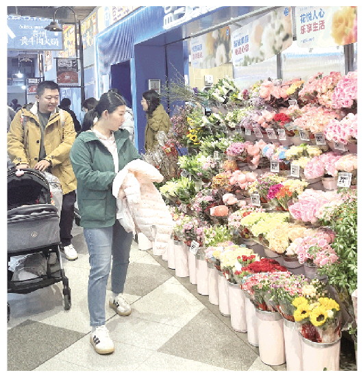 春天的花香不仅弥漫在街巷,更飘进了商圈。在城区万达广场、新辰天地购物中心等商超内的生活集合店,鲜花绿植被摆在显眼位置,永生花礼盒、小型盆栽、创意花束等应有尽有,吸引了不少消费者选购。
