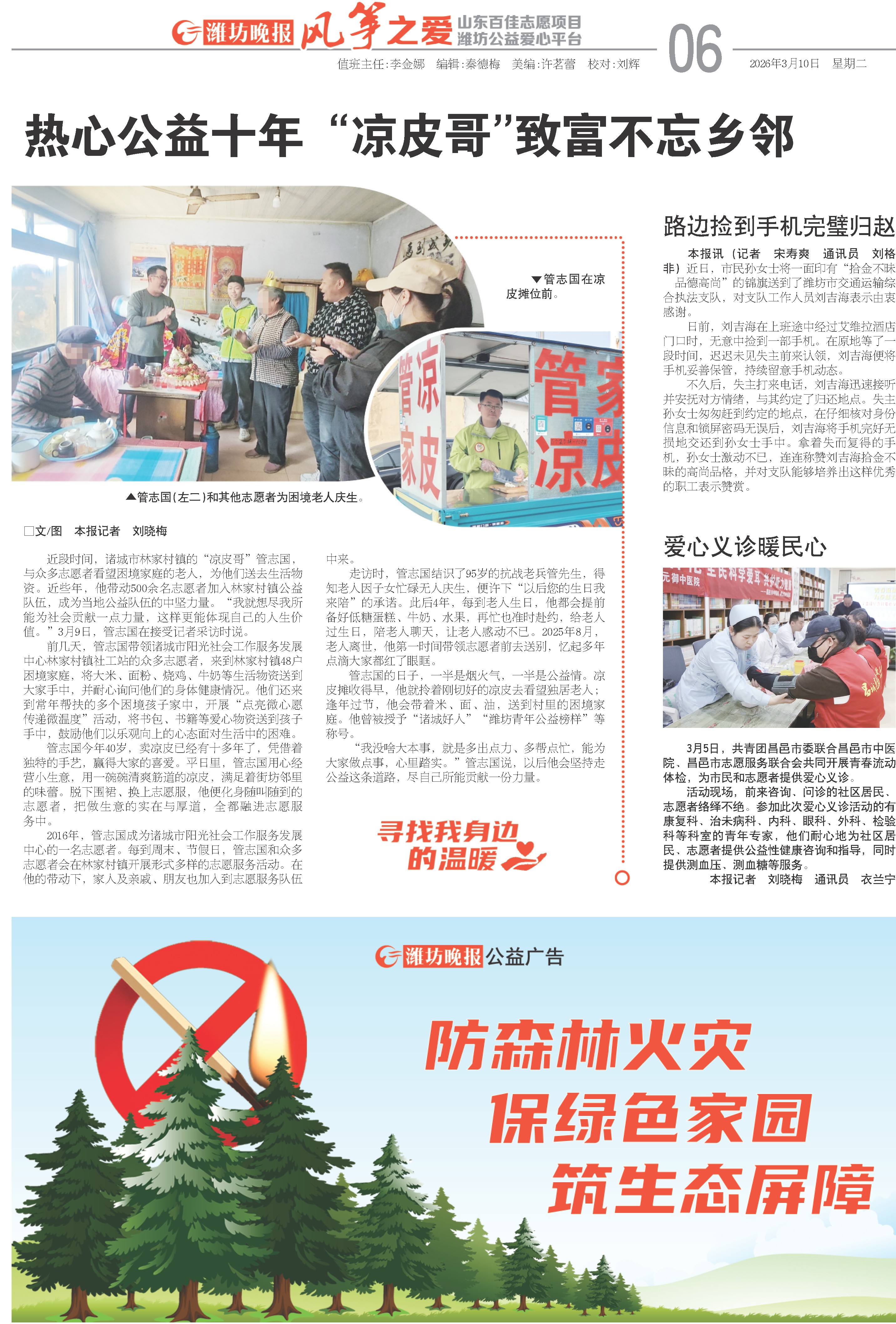 管志国的日子,一半是烟火气,一半是公益情。凉皮摊收得早,他就拎着刚切好的凉皮去看望独居老人;逢年过节,他会带着米、面、油,送到村里的困境家庭。他曾被授予“诸城好人”“潍坊青年公益榜样”等称号。