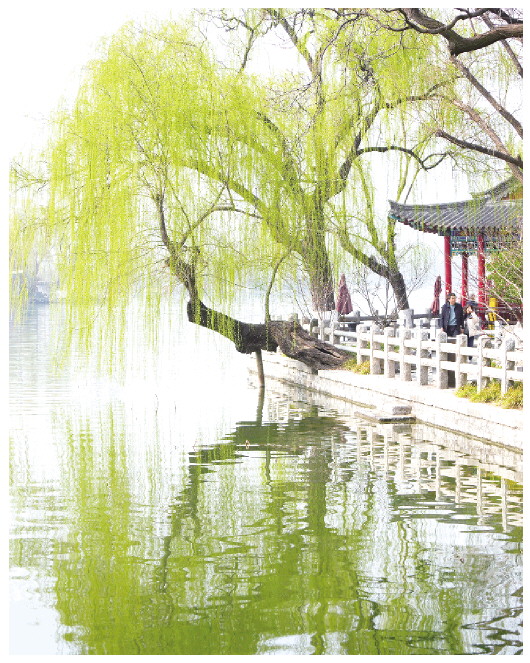 3月17日,游客在大明湖观光。近日,山东济南气温回升,大明湖畔的柳树披上新绿,吸引游客前来踏春游览。大明湖以“四面荷花三面柳,一城山色半城湖”的风光闻名。 新华社发