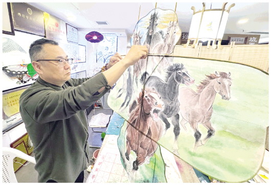 3月17日,在潍坊十笏园非遗空间班墨坊内,潍坊传统风筝第四代代表性传承人刘志江正在整理刚刚制作完成的“八骏”风筝。据了解,“八骏”风筝宽1米、高1.2米,以潍坊传统硬翅风筝造型设计,风筝上绘制了八匹骏马奔驰形态,一经亮相便吸引了众人目光。 本报记者 张驰