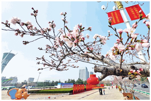 3月24日,随着气温升高,在市人民广场以及广通路等城区赏樱地点,樱花已经悄然绽放,朵朵樱花相互簇拥,微风吹过,摇曳生姿,吸引了过往市民的目光。图为市人民广场前樱花初绽。 本报记者 张驰