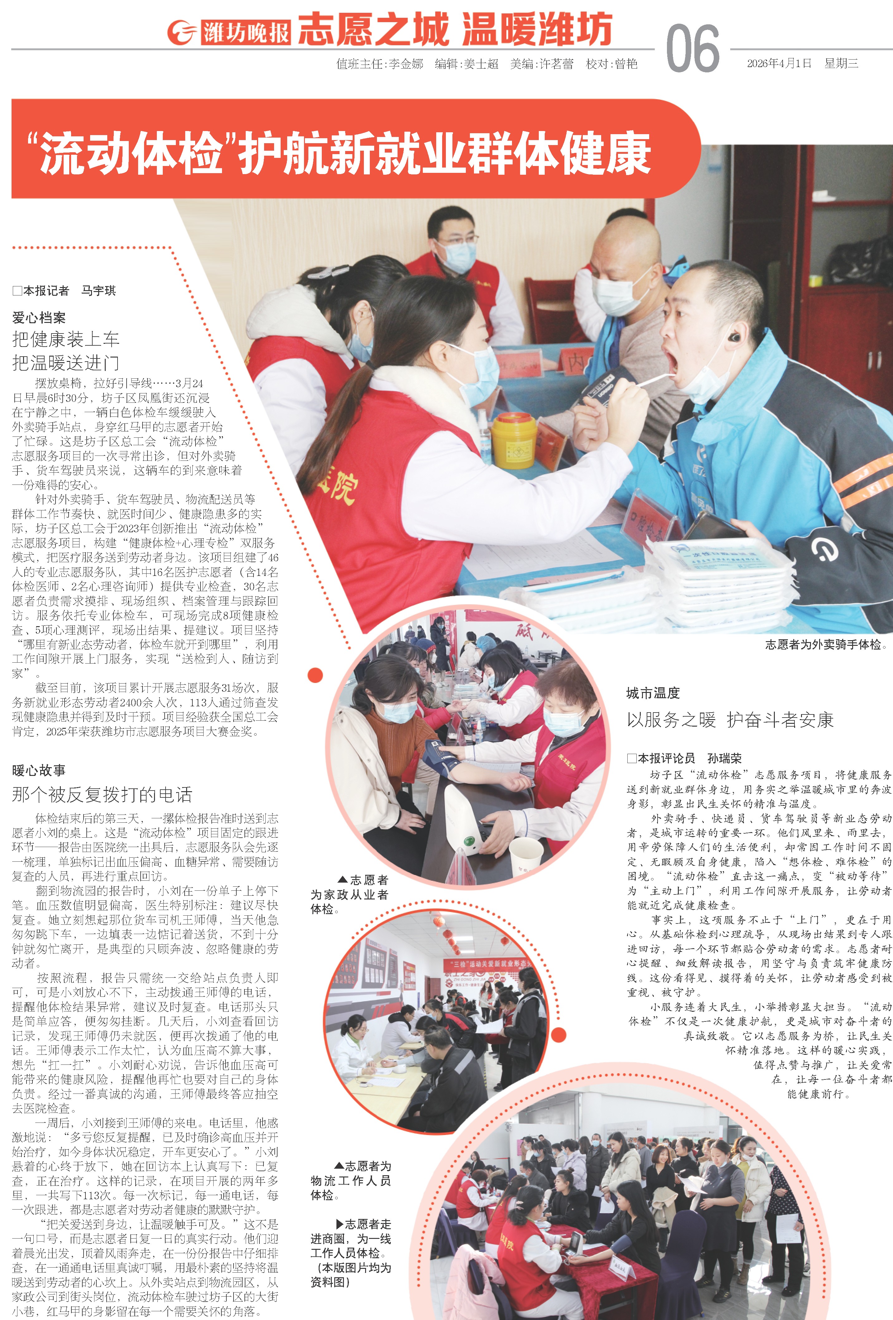 坊子区“流动体检”志愿服务项目,将健康服务送到新就业群体身边,用务实之举温暖城市里的奔波身影,彰显出民生关怀的精准与温度。
