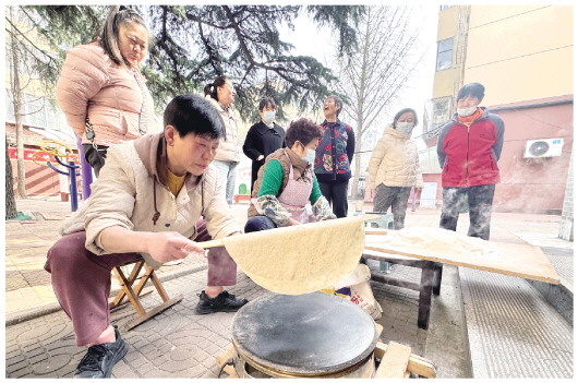 3月31日,在奎文区东关街道奎文门社区,居民们正在擀饼。清明节临近,该社区居民聚在一起支起鏊子擀饼,周围弥漫着饼的香气。他们将擀好的饼送给街坊邻里,按照潍县传统习俗迎接清明节。 本报记者 张驰