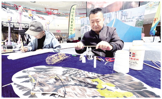 4月11日,风筝艺人正在扎制风筝。当日,一场“我和风筝有个约会”活动在奎文区万达商圈举行,现场进行了盘鹰风筝放飞表演以及风筝制作技艺展示,让市民沉浸式体验潍坊风筝文化。 本报记者 张驰