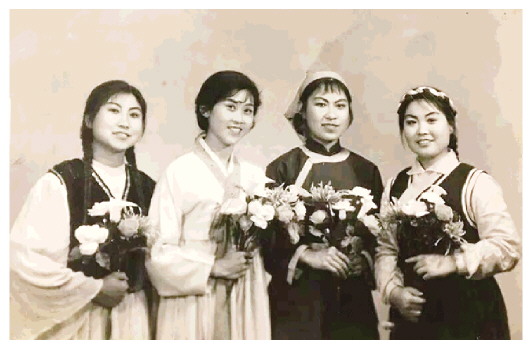 1977年的一张“即兴合照”,则展现了老师们鲜为人知的活泼一面。当时学校的民族歌舞演出结束后,田华丽、黄慧玲、刘萍、陈海军四人到歌舞团还服装时,黄慧玲突然提议穿上演出服,照张相片。这个提议立刻得到其他三人的响应。平时给学生化妆、送学生上舞台的老师们,也想过把舞台瘾。四人说着笑着开始化妆,挑选自己喜欢的民族服装,拍照前还忍不住秀了几手:刘萍献出洁白的哈达,田华丽模仿挤牛奶的动作抖起肩膀,黄慧玲打起长鼓,陈海军晃起脖子扭动手腕,笑容在镜头面前定格。离开了学生,她们也成了一群无拘无束的孩子。