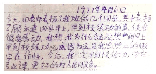 今天,田老师表扬了我班的几个同学,其中表扬了顾永建同学早上早到校练功的事,使我很受感动,我想我为什么就没想到早上早到校练功呢,这是我思想的懒字在作怪。今后,我一定早到校练功,学好专业课,更好地为人民服务。”