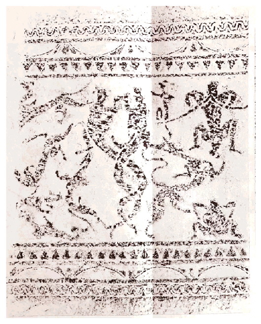 安丘汉画像石墓中历史故事类画像很少,内容比较明确的有中室西侧门旁立石上的秦始皇泗水捞鼎图,画面是在一河的两岸上各立一滑车,有绳穿过滑车系住鼎耳,右岸两人,左岸一人正向上拉,鼎已升出水面,然左鼎耳脱落,左绳松弛,拉者似也因此而跌坐于地。
