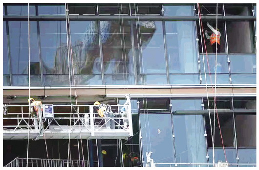 4月20日,在市区一在建小区,几名工人正在进行玻璃幕墙安装。一块块玻璃的拼接,不仅是建筑外立面的成型,更是城市发展的生动注脚。